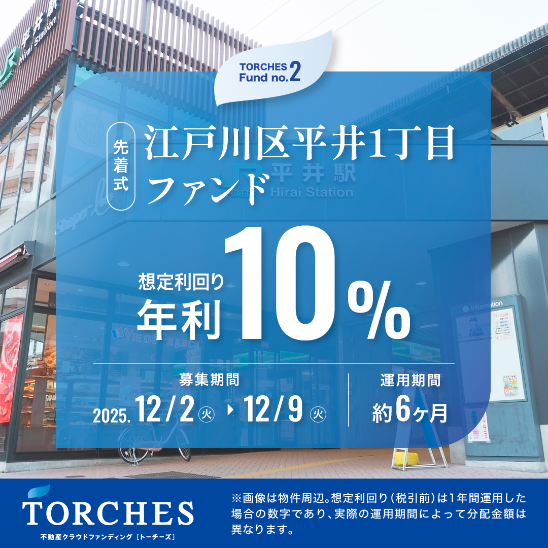 本日 2025年12月2日(火) 12:00~、第2号ファンドとなる【江戸川区平井1丁目ファンド】を募集開始しました!