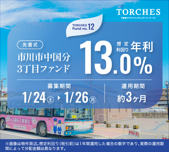 【ファンド情報】 ■ファンド名:市川市中国分3丁目ファンド■ 総募集金額:460,350,000円 ■ 想定利回り(年利):13.0% ■ 運用期間:3ヶ月 ■ 募集期間:【先着式】1/24(土)12:00~1/26(月)12:00