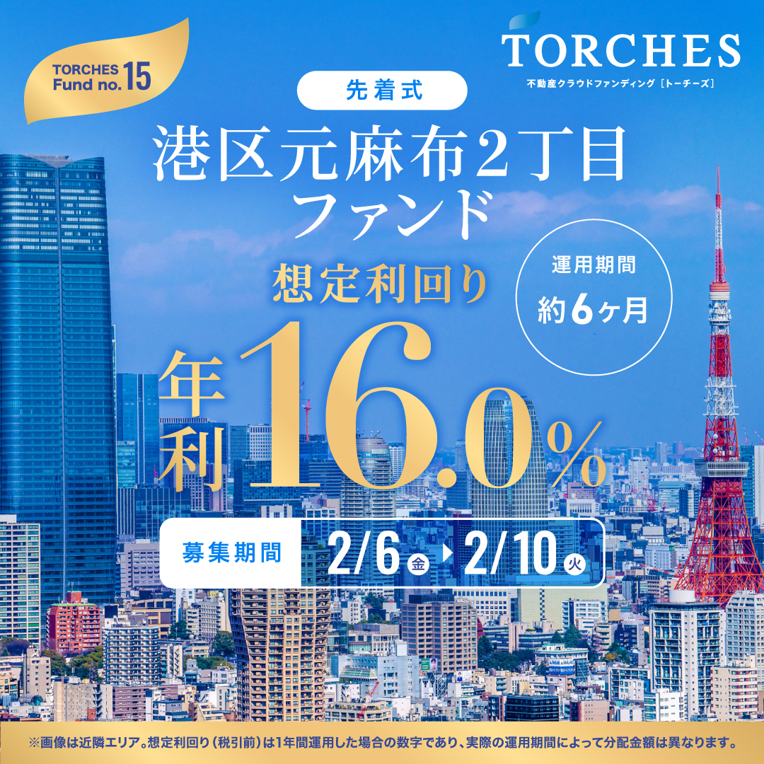 【ファンド情報】■ファンド名:港区元麻布2丁目ファンド■ 総募集金額:1,376,100,000円 ■ 想定利回り(年利):16.0% ■ 運用期間:6ヶ月 ■ 募集期間:【先着式】2/6(金)12:00~2/10(火)12:00