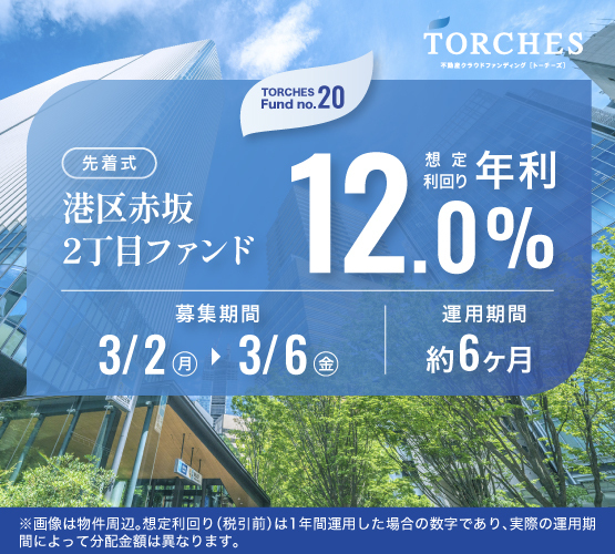 この度、【No.20 港区赤坂2丁目ファンド】を開示しました。━━━━━━━━━━━━━━━━━━■ No.20 港区赤坂2丁目ファンド━━━━━━━━━━━━━━━━━━■ 総募集金額:703,890,000円 ■ 想定利回り(年利):12.0% ■ 運用期間:6ヶ月 ■ 募集期間:【先着式】3/2(月)12:00~3/6(金)12:00