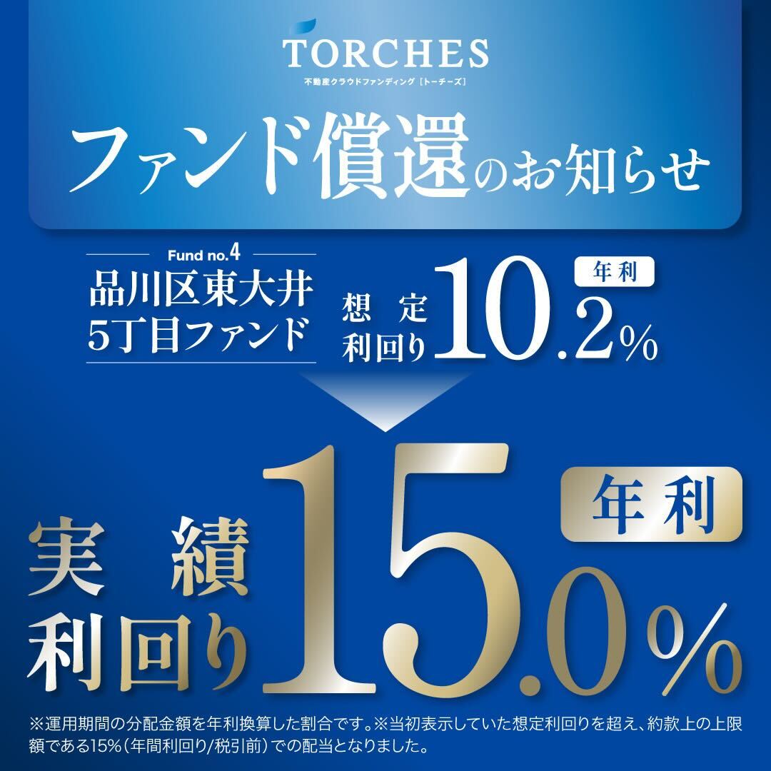 この度、【No.4 品川区東大井5丁目ファンド】につきまして分配償還を実施いたしましたのでご報告申し上げます。本ファンドは順調な運用ならびに売却進捗により、当初予定より早期終了となりました。