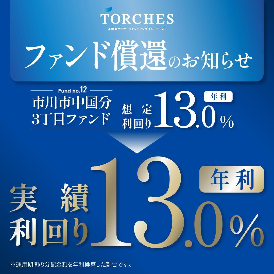■ ファンド概要・ファンド名:No.12 市川市中国分3丁目ファンド・実績利回り:年利 13.0%・運用終了日:2026年3月19日 (木)・分配償還日:2026年3月19日 (木)