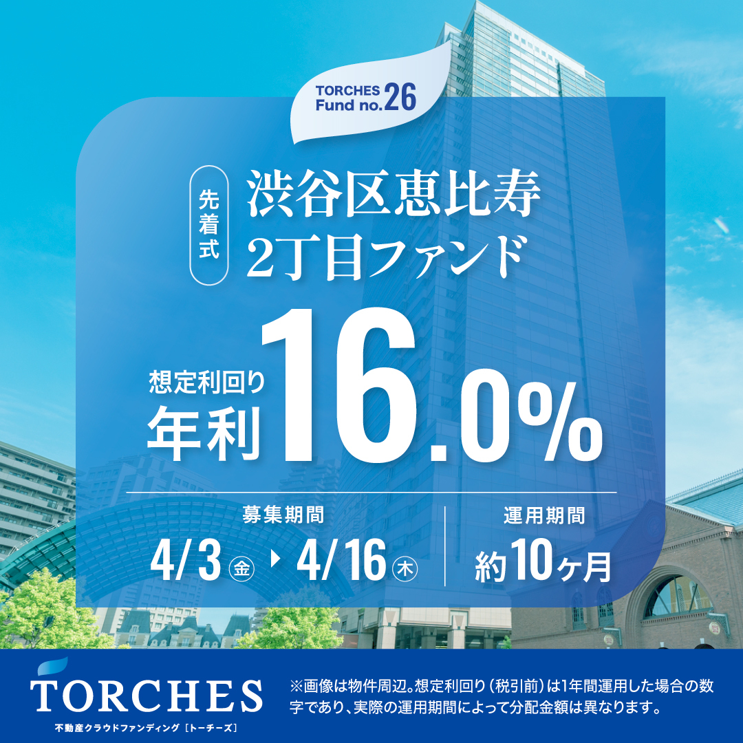 ━━━━━━━━━━━━━━━━━━■ No.26 渋谷区恵比寿2丁目ファンド━━━━━━━━━━━━━━━━━━■ 総募集金額:1,921,590,000円 ■ 想定利回り(年利):16.0% ■ 運用期間:約10ヶ月 ■ 募集期間:【先着式】4/3(金)12:00~4/16(木)12:00