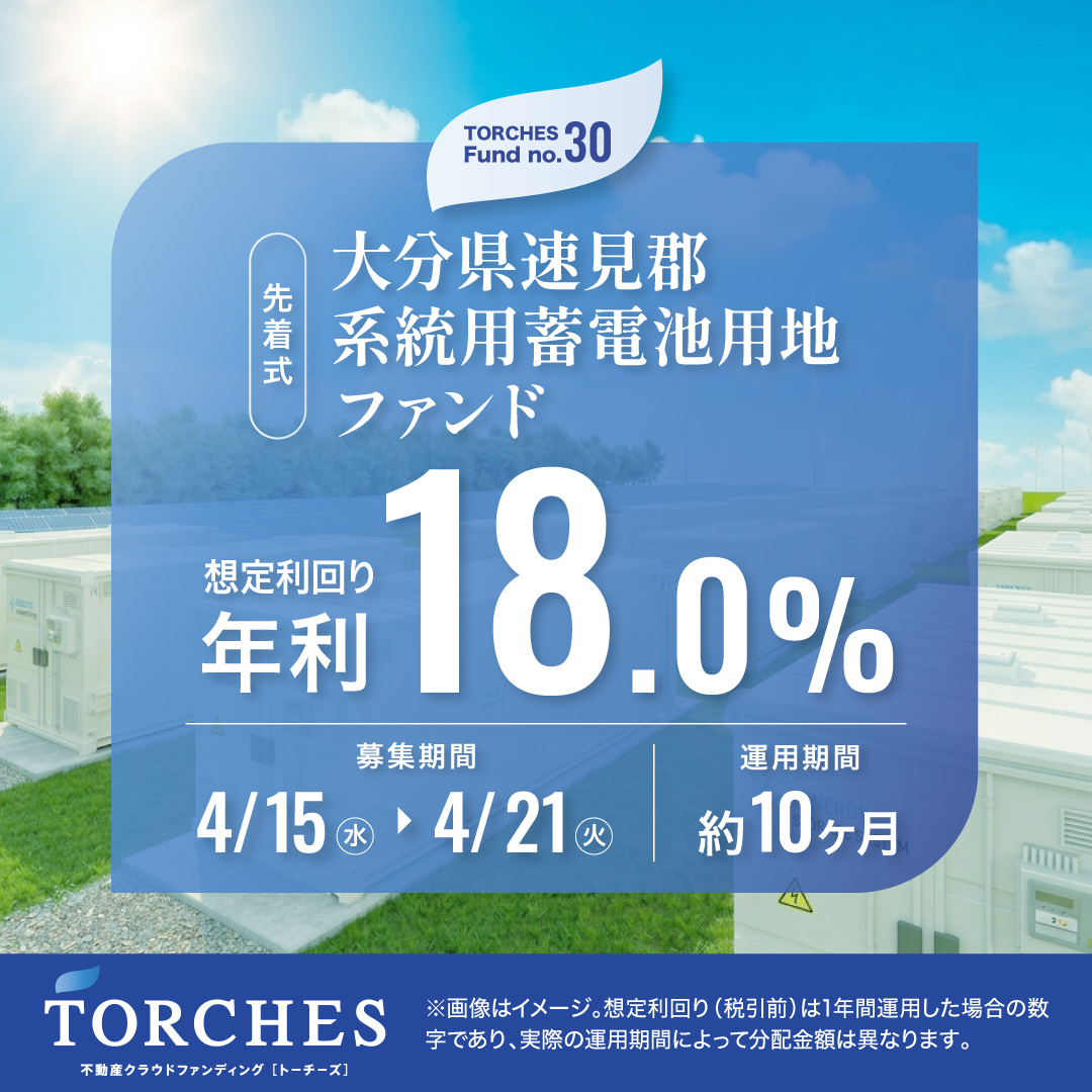 ━━━━━━━━━━━━━━━━━━■No.30 大分県速見郡 系統用蓄電池用地ファンド━━━━━━━━━━━━━━━━━━■ 総募集金額:516,780,000円 ■ 想定利回り(年利):18.0% ■ 運用期間:約10ヶ月 ■ 募集期間:【先着式】4/15(水)12:00~4/21(火)12:00