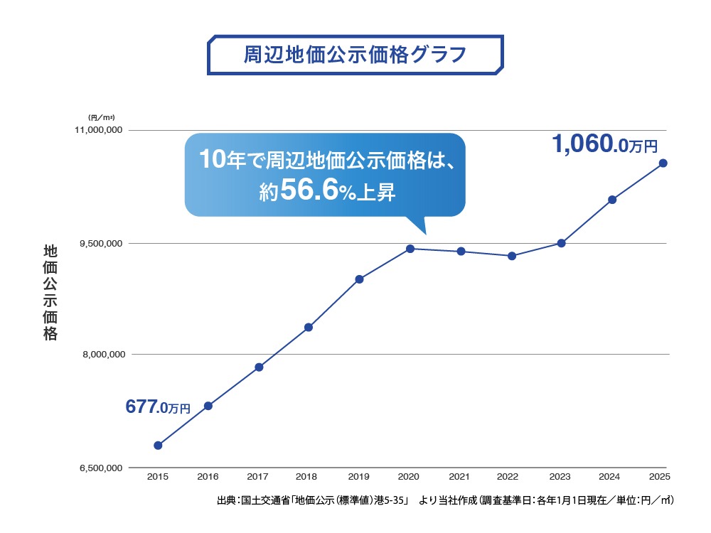 本物件周辺の地価は、過去10年間で上昇傾向にあります。2015年には677万円/㎡だった水準が、2025年には1,060万円/㎡へと推移し、10年間で約56.6%の上昇率を記録しています※1 。