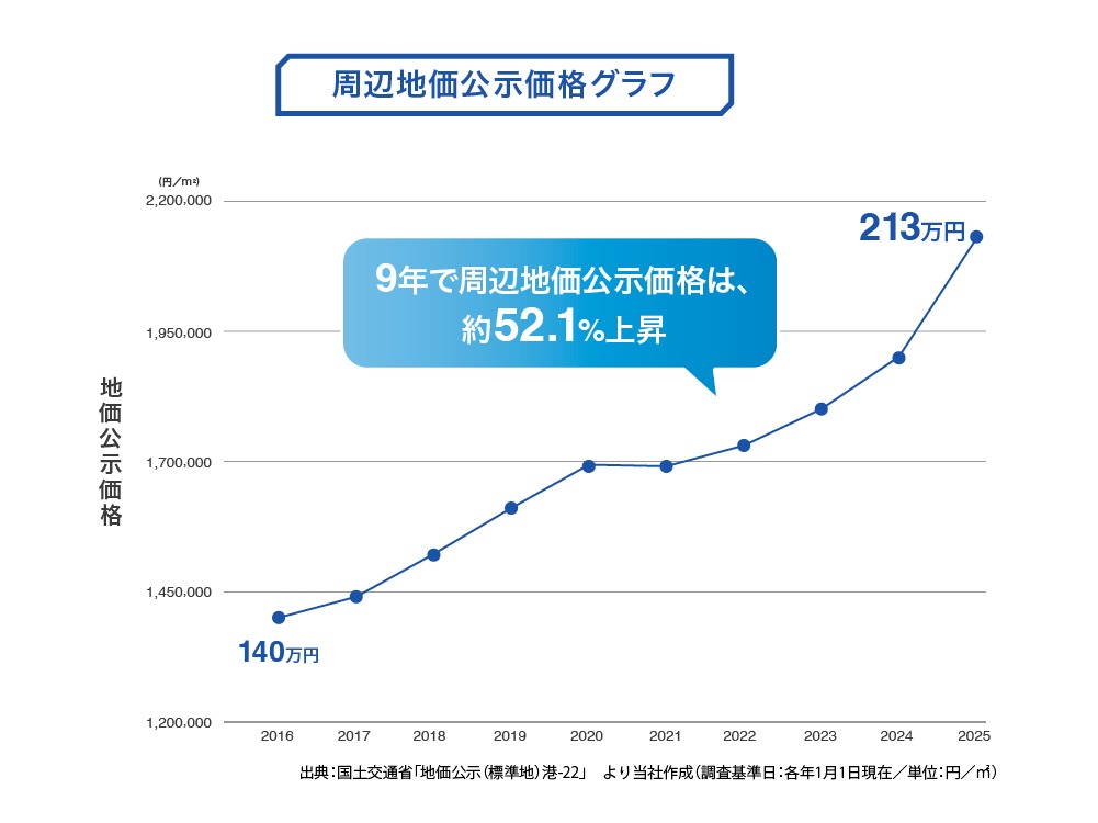 本物件周辺の地価は、過去9年間で上昇傾向にあります。2016年には140万円/㎡だった水準が、2025年には213万円/㎡へと推移し、9年間で約52.1%の上昇率を記録しています※1 。