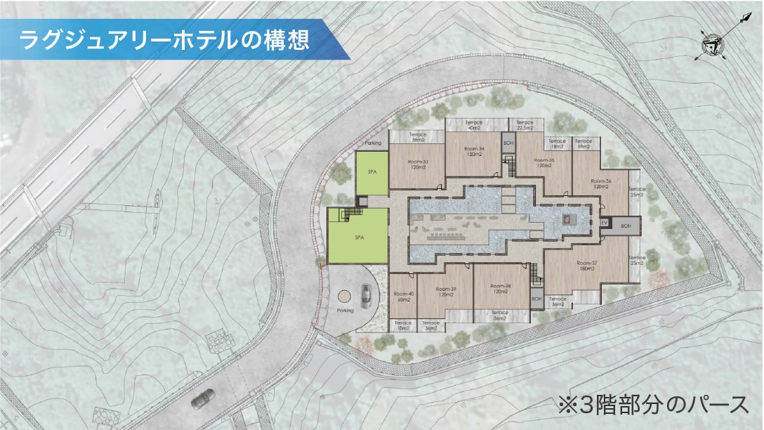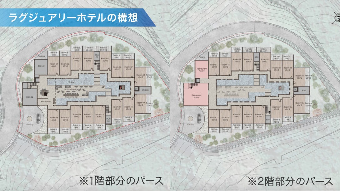 現在、本物件においては、ラグジュアリーリゾートホテルの開発構想が進められています。TORCHES(トーチーズ)が提案する計画では、約40室の客室に加え、スイートルーム、スパ、テラスなどを完備した、長期滞在も可能なラグジュアリーホテルを建設可能と想定しています。