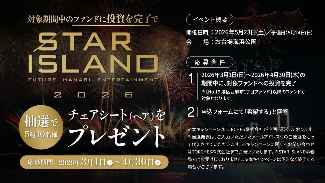 TORCHESは、不動産を小口化することで、これまで高額資金が必要だった不動産投資を少額から始められるのが特徴です。出資額に応じて賃料収入や売却益から分配金を受け取ることができ、物件の管理や運営はすべてTORCHESが行うため、気軽に投資に参加いただけます。