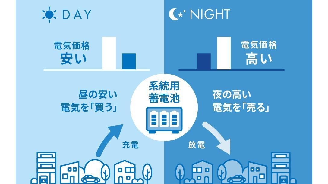 電力市場では、太陽光発電が集中する日中は電力が余って価格が下がり、需要が高まる夕方以降は価格が上昇する傾向があります。系統用蓄電池事業はこの価格差を活用し、安い時間帯に充電し、高い時間帯に放電することで収益を得るビジネスモデルが可能とされています※2 。