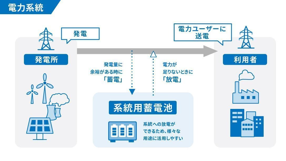 近年では、再生可能エネルギーの導入拡大や電力市場の整備を背景に、系統用蓄電池の導入や関連事業への取り組みも広がりつつあります。電力系統に接続して電力需給のバランスを調整する設備として、今後の導入拡大が期待されています。
