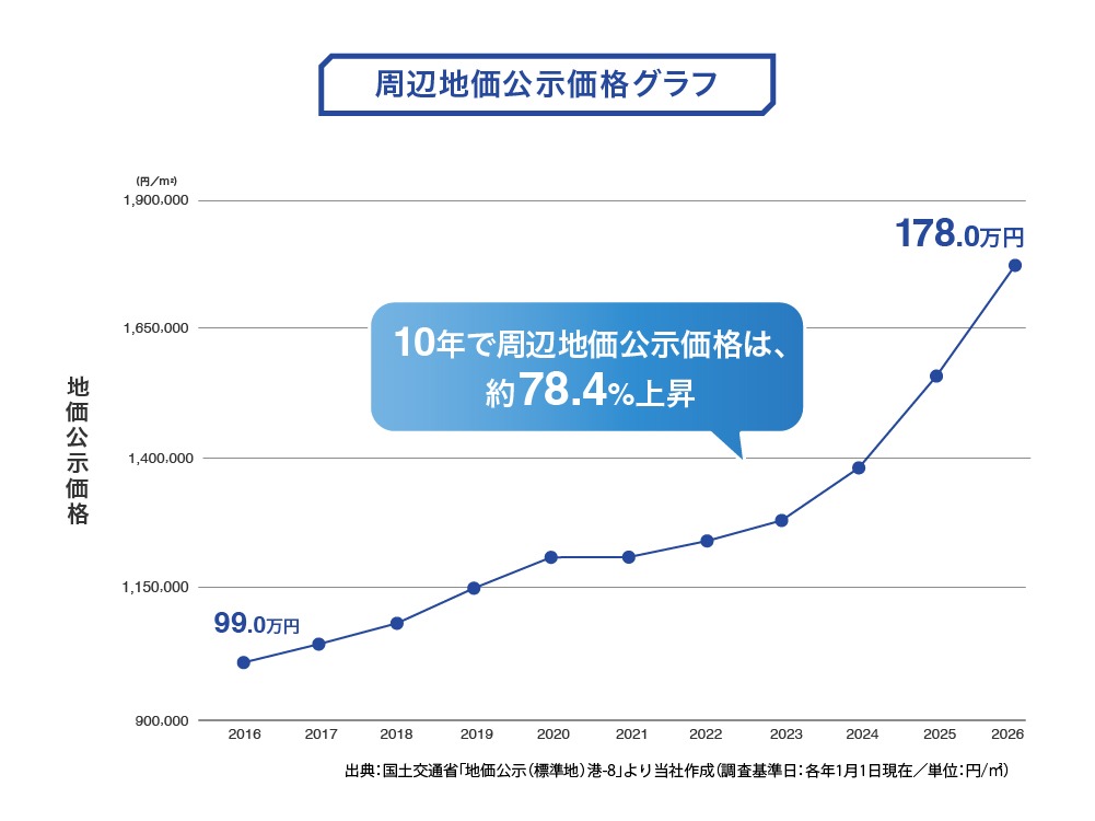 本物件周辺の地価は、過去10年間で上昇傾向にあります。2016年には99.6万円/㎡だった水準が、2026年には178.0万円/㎡へと推移し、10年間で約78.4%の上昇率を記録しています※1。